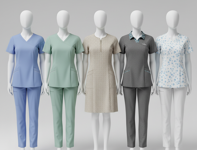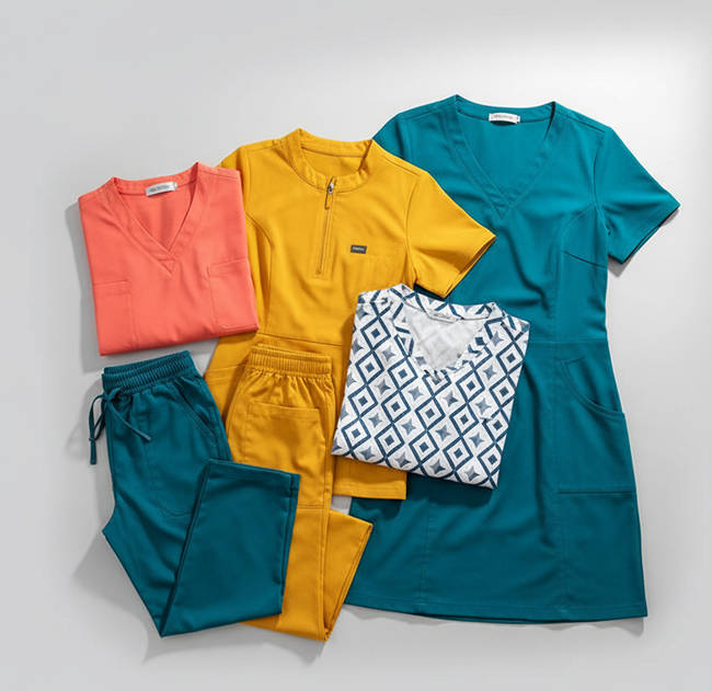 - Modern Professional Styles: Available in classic scrubs, tunic-pant combinations, and tailored scrub dresses — all in a range of vibrant, soothing colors.